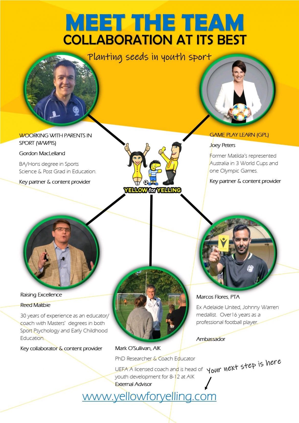 We are very excited to be continuing and further expanding our work in Australia by forming part of the consultancy team for Yellow for Yelling alongside world renowned coach developer Reed Maltbie and former Matilda and founder of Game Play Learn Joey Peters.